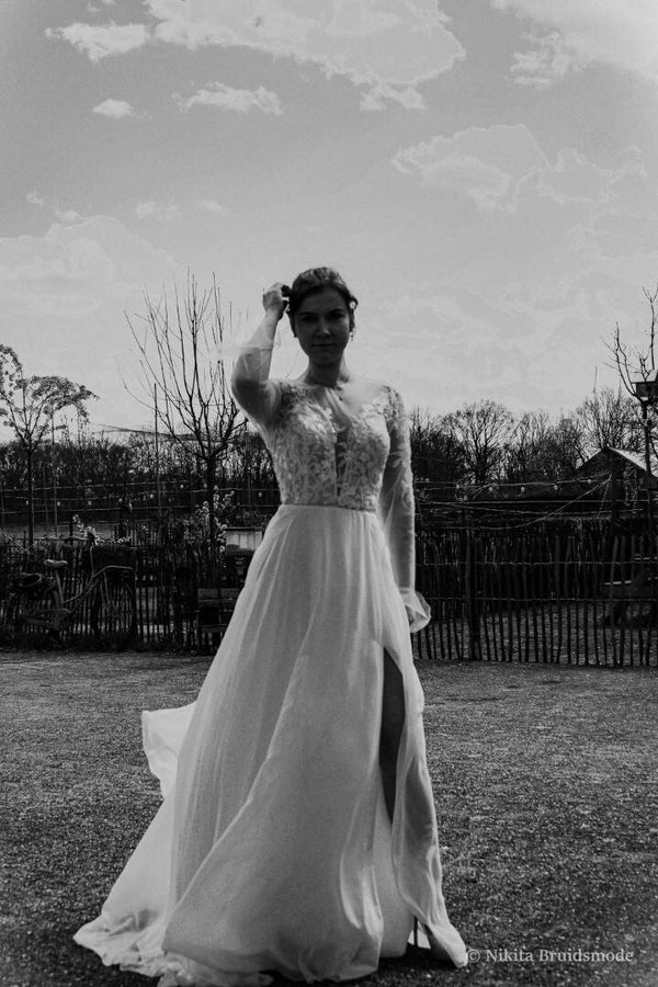 Chiffon illusie kanten bruidsjurk met dromerige a-lijn rok en split