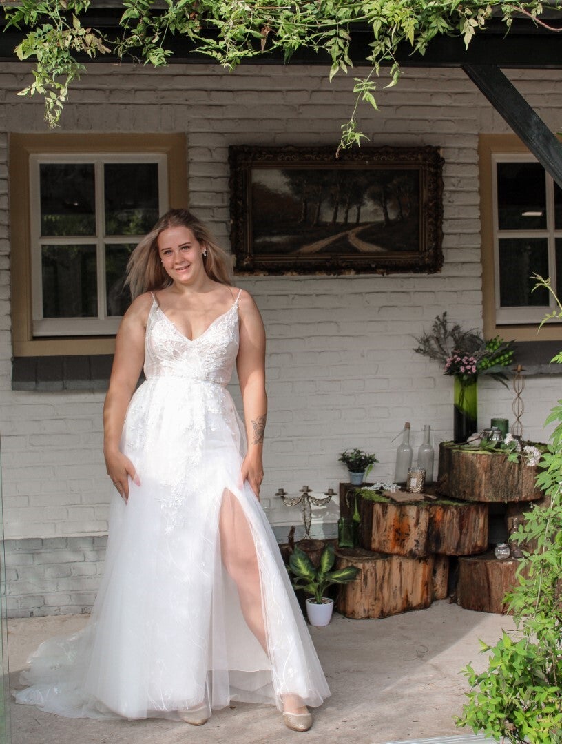 Deze bruidsjurk is valt als een maat 38 maar onze coupeuses kunnen deze jurk ook voor je aanpassen naar een maatje 34-36 of eventueel groter naar een 40*