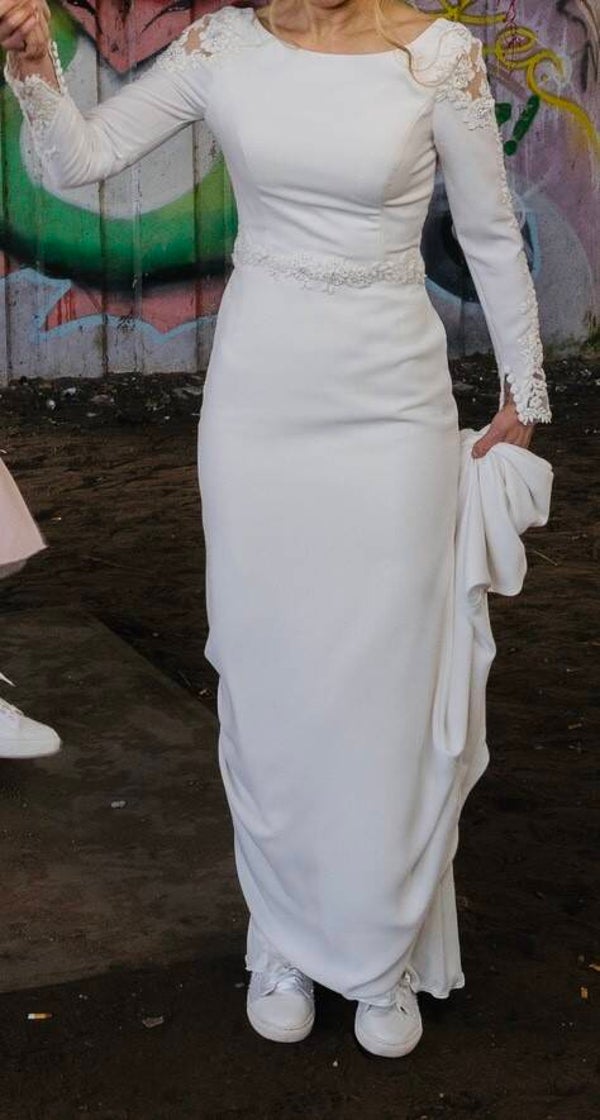 Stap in de wereld van tijdloze elegantie met onze adembenemende jurk in een aansluitend model, doordrenkt met prachtige kanten details die elke blik vangen. Deze jurk belichaamt verfijning en exclusiviteit, met een rugpand en mouwen die speciaal en uniek zijn, exclusief gemaakt voor deze betoverende creatie.