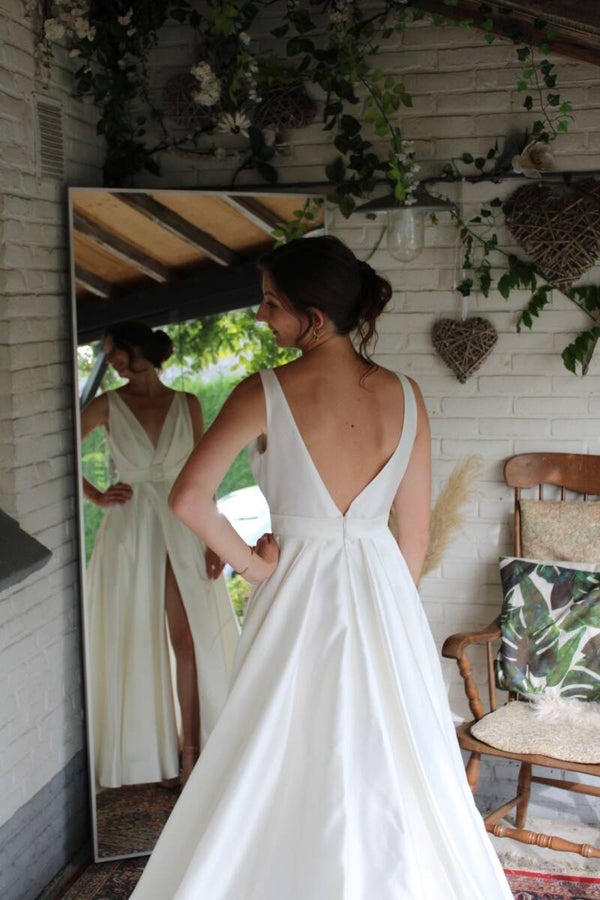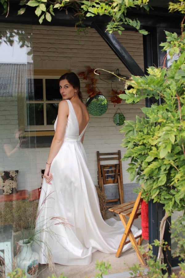 Laat je verrassen door de moderne elegantie van deze gladde bruidsjurk, ontworpen voor de bruid van vandaag, die streeft naar tijdloze gratie met een eigentijdse twist. Met een slank silhouet dat moeiteloos langs je lichaam valt, omhult deze jurk je rondingen op een verfijnde manier.