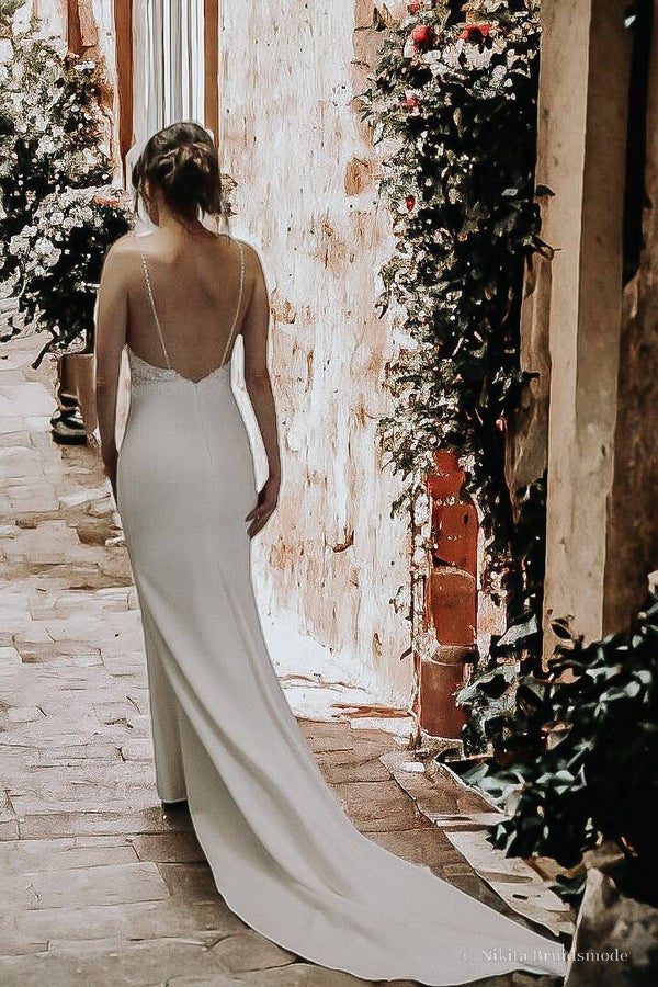 Modern,tweedehands,beach, elegant, trouwjurk, bohemian, satindress, boothals