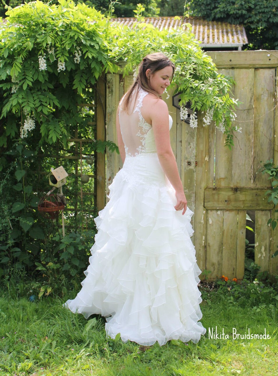 Deze bruidsjurk is valt als een maat 40-42 maar onze coupeuses kunnen deze jurk ook voor je aanpassen naar een maatje 36-38 of eventueel groter naar een 44*