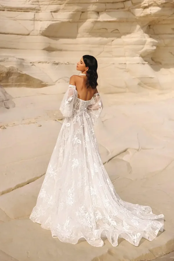 Een onconventionele off-shoulder A-lijn jurk is gemaakt van Chantilly-kant dat is geborduurd met pailletjes. De jurk is omhuld met grote kanten bloemen en bladeren. Het lijfje benadrukt de taille prachtig en is versierd met stijlvolle, weelderige afneembare mouwen. Deze zijn gemaakt van hoogwaardig gaas en kant. De rok loopt uit in een lange sleep.Deze trouwjurk is een maat 40 en we kunnen deze (indien mogelijk) in je maat aanpassen, over het algemeen kunnen we 2 maten aanpassen groter of kleiner. * Of bij de leverancier op uit voorraad halen.