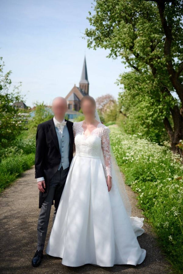 Deze trouwjurk is een maat 38-40 en we kunnen deze (indien mogelijk) in je maat aanpassen, over het algemeen kunnen we 2 maten aanpassen groter of kleiner. *