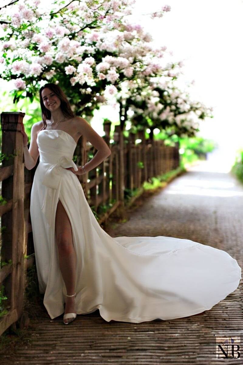 Deze trouwjurk is een maat 38-40 en we kunnen deze (indien mogelijk) in je maat aanpassen, over het algemeen kunnen we 2 maten aanpassen groter of kleiner. *
