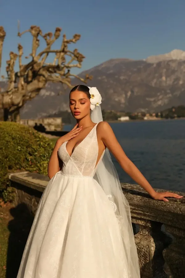 💍 Details: 3D bloemen, diepe V-hals, open rug, tule rok, zachte glans