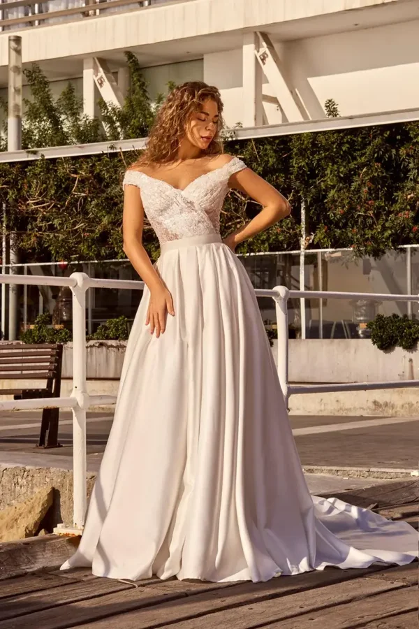 Victoria Soprano, Katherine Joyce, Beatriz, tweedelige trouwjurk, off-shoulder trouwjurk, mikado rok, transparant lijfje, romantische bruidsjurk, elegante trouwjurk, trouwjurk met glans, trouwjurk zonder mouwen, moderne klassieke jurk, Nikita Bruidsmode