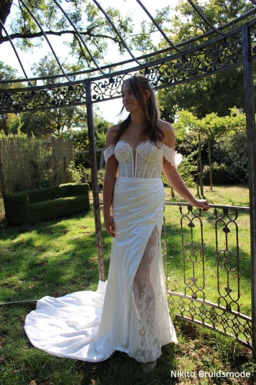 nieuwe trouwjurk maat 40, off-shoulder trouwjurk, trouwjurk met split, bruidsjurk met kant, sexy trouwjurk maat 40, Nikita Special, trouwjurk met corset, trouwjurk met sleep, boho chic bruidsjurk