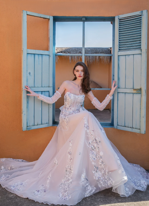 De luxe corset-bodice vormt je taille prachtig en geeft je die elegante pasvorm waar bruiden zo van houden. Op de rug wordt de geplooide tule gestrikt in een sierlijke bow-tie. De afneembare off-shoulder tule mouwtjes zorgen voor twee looks: romantisch, dromerig fairytale of modern chic.