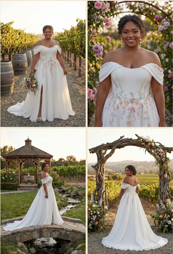 Nikita Special plussize trouwjurk – Off-shoulder A-lijn met kleurrijke geborduurde bloemen | Maat 48-50 S2