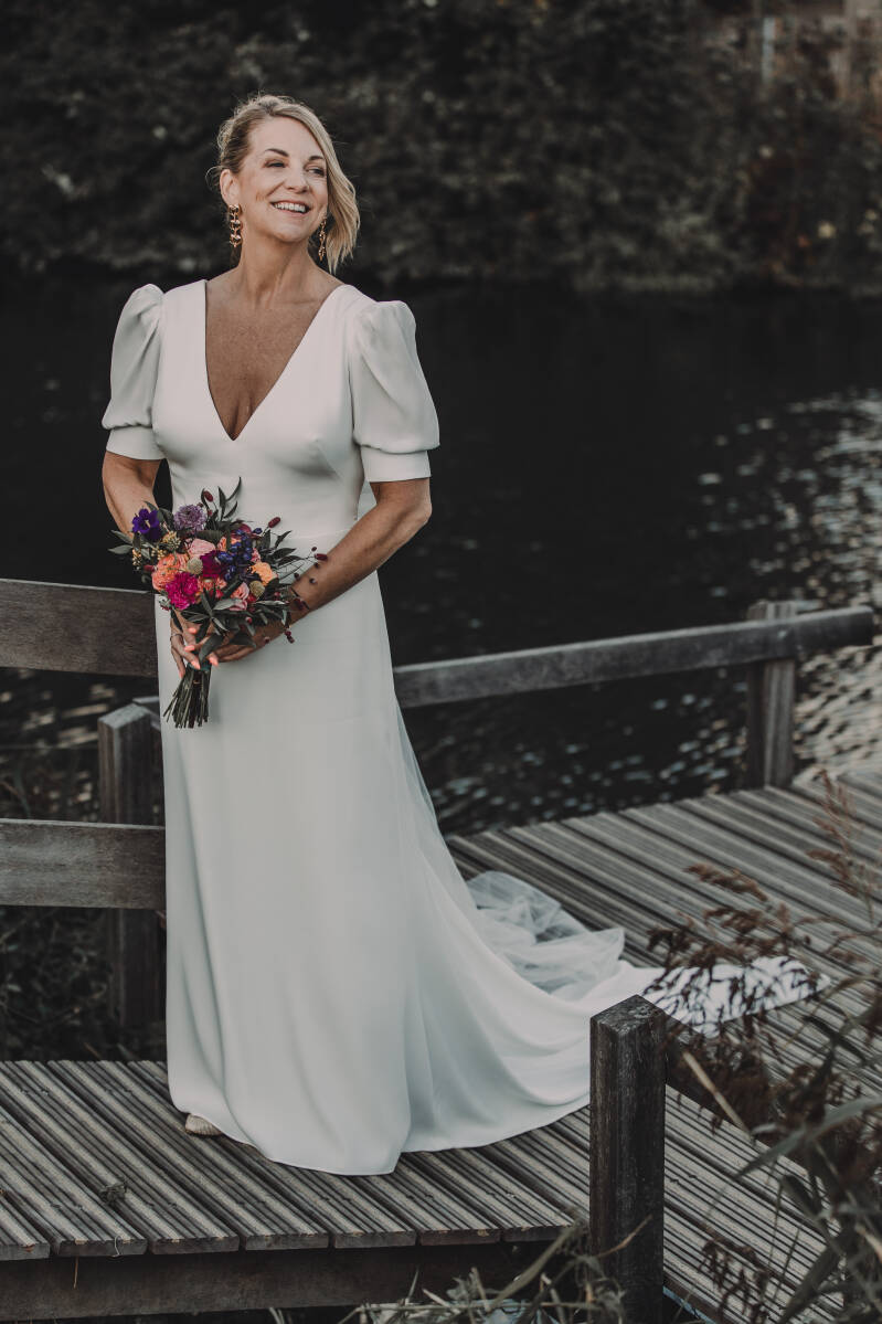 All Who Wander / tweedehands trouwjurk / bruidsjurk / maat 40 / minimalistisch / open rug / strik / korte mouwen / moderne trouwjurk / clean bridal