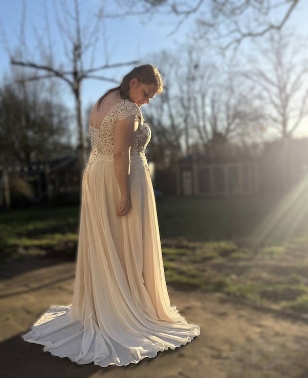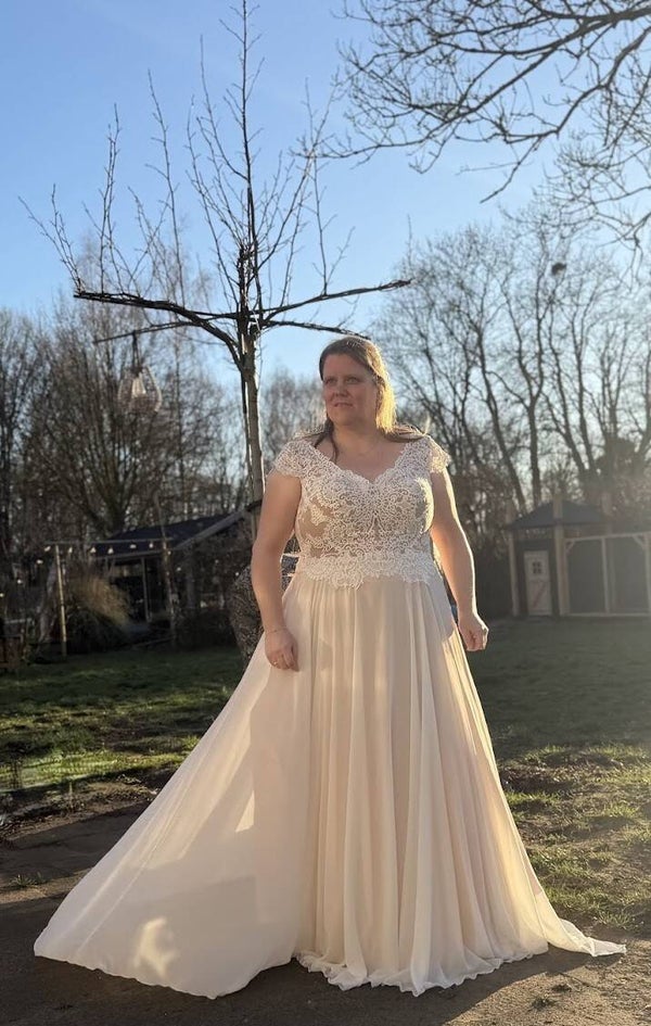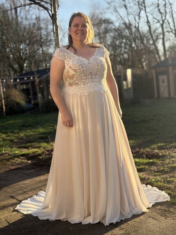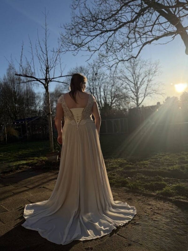 Een prachtige tweedehands bruidsjurk in plussize maat 46 voor bruiden die op zoek zijn naar een romantische, flatterende trouwjurk met karakter.