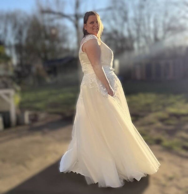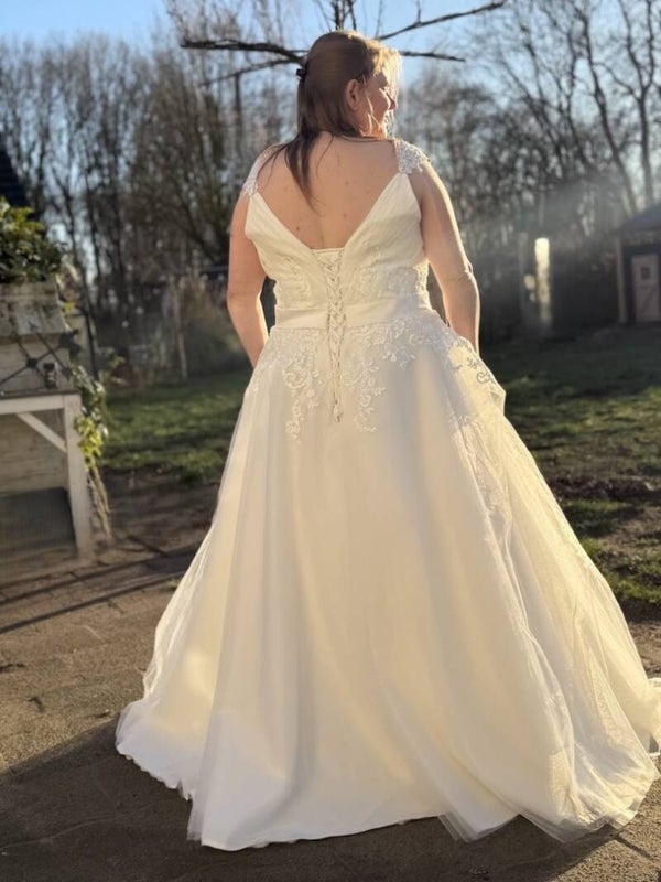Deze nieuwe plussize trouwjurk in maat 44-46 is een romantische A-lijn bruidsjurk met een elegante en flatterende pasvorm. Het zachte tule en het verfijnde kant geven de jurk een lichte, dromerige uitstraling, terwijl het lijfje mooi vorm geeft aan het bovenlichaam.