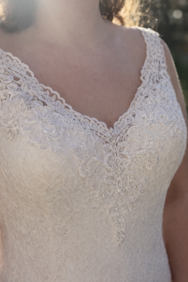 Het lijfje van deze kanten trouwjurk is volledig afgewerkt met verfijnd kant en subtiele kralenborduursels. De V-hals aan de voorkant geeft de bruidsjurk een elegante en open uitstraling. Aan de achterkant heeft deze trouwjurk een prachtige kanten rug met knoopsluiting, wat zorgt voor een klassieke en tijdloze look.