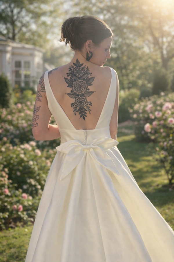 De jurk eindigt in een sierlijke sleep, waardoor het silhouet zowel tijdens de ceremonie als op foto’s prachtig uitkomt.
