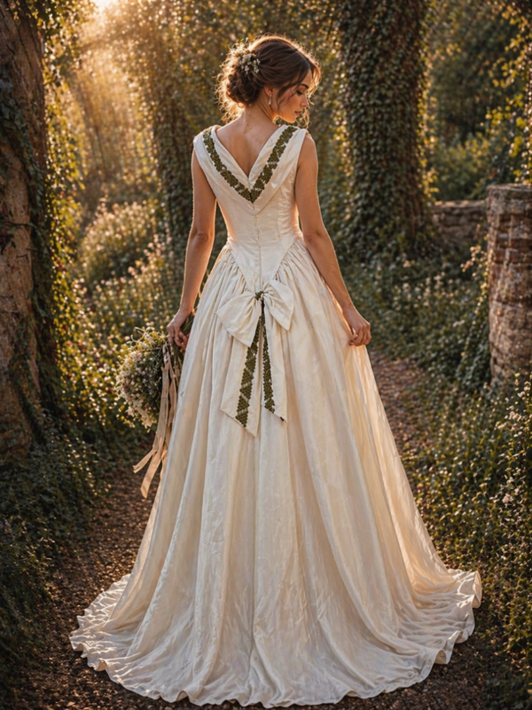 De warme ivoorkleur in combinatie met de subtiele groene details geeft deze jurk een natuurlijke, bijna koninklijke rust.