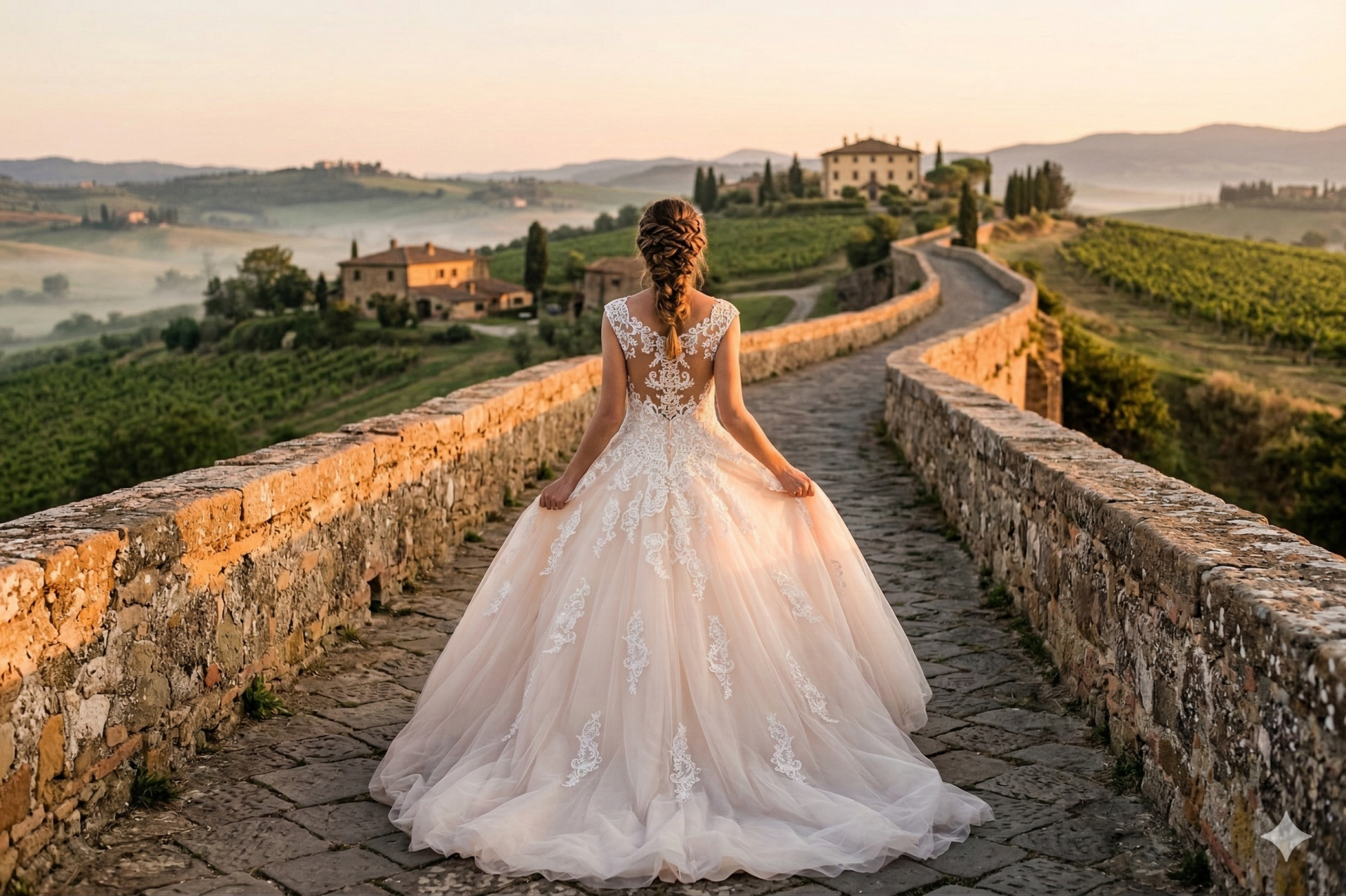 Het lijfje is verfijnd afgewerkt met delicaat kant dat elegant doorloopt over de schouders en de transparante rug. Dit zorgt voor een vrouwelijke en stijlvolle uitstraling. De open rug met kanten details maakt de jurk extra elegant en geeft een mooie, romantische look.