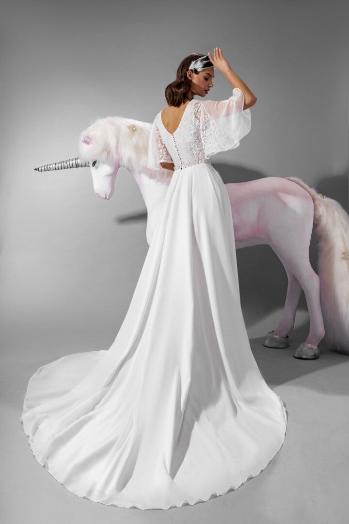 Een geweldige bruidsjurk met velvet bovenkant en subtiele glitterceintuur. De mouwen vallen klokkend en zijn voorzien van chiffon en velvet met barok structuur.