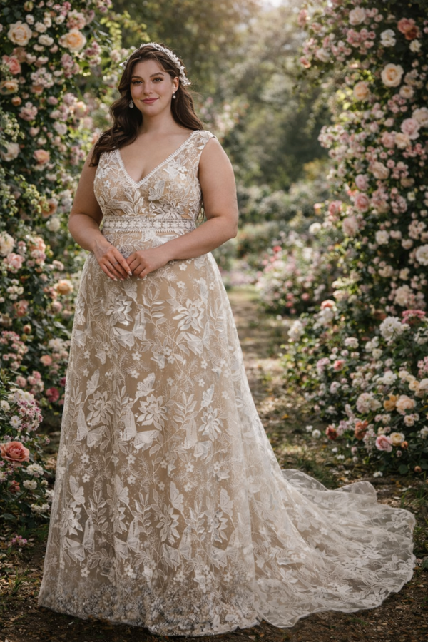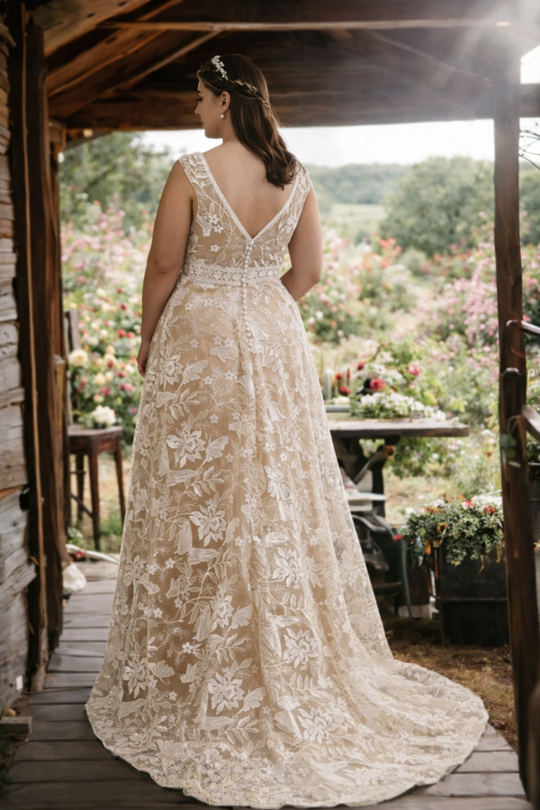 plussize bruidsjurk maat 46, Nikita Special bruidsjurk, A-lijn trouwjurk maat 46, boho trouwjurk plussize, trouwjurk kant nude ivory, romantische bruidsjurk maat 46, Nikita Bruidsmode